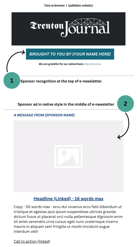 All sponsored content will be included in perpetuity on the Trenton Journal website. Each article will also be featured in one newsletter issue.