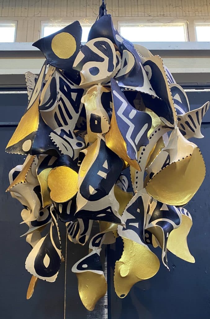 Trenton Journal met with Clifford Ward in his studio at Grounds for Sculpture, where he commutes from his home in downtown Philadelphia. Like the exhibit at Artworks, his studio is a feast for the eyes: No matter where you look, there is something fascinating. The pieces all belong together but they show different directions for one artist’s creative impulse, whether they are paintings on a wall or sculptures suspended from the ceiling. His “Fluidity” series consists of organic forms that he creates using stockings stretched over wire coat hangers that he has bent and curved into swirling shapes; he then coats them with gesso (artists’ acrylic primer) and paints them with acrylic, then hangs them together from above as mobiles. One is especially drawn to Ward’s “Guardian” figures in his “Animism” series: twenty-four sculptures with a humanoid presence. They are life-size and larger, and they project a sense of dignity and strength. Many of them have faces that the artist creates by casting his face in plaster, which he changes freely for different pieces. “Sometimes people see them and they see that it’s me, but often they don’t.” For some of their eyes, Ward uses cowrie shells — often used in African art and jewelry, and some cultures used as currency. “The cowrie shells change the entire essence of the face. They have a special meaning, especially when you place them in the eyes — they signify insight and perspective. That’s pretty much how I use them.” A viewer might imagine the Guardians looking back at them or looking into the future — as if we are invited to have a dialogue with the figures. The Guardians are not strictly human figures. Some of their limbs or other body parts appear more angular and mechanical, perhaps like those of robots in a science fiction story; but at the same time, they hold the memory of Africa and the slave trade. The Guardians are paired, with each pair displaying similar but varying characteristics, like mirror images. Each is unique, with its surface treatment of patterns created with objects such as nails, ceramic cups, small mirrors, or cloth. Among the most disturbing images are slave collars on one pair: Clifford described these torturous devices as steel collars with four long rods with hooks on the ends that could break the wearer’s neck and would severely hinder any efforts to escape. “I’m realizing most of my work is duplicated in different ways — it gives me the chance to experiment with variations in color and other aspects of the work.”