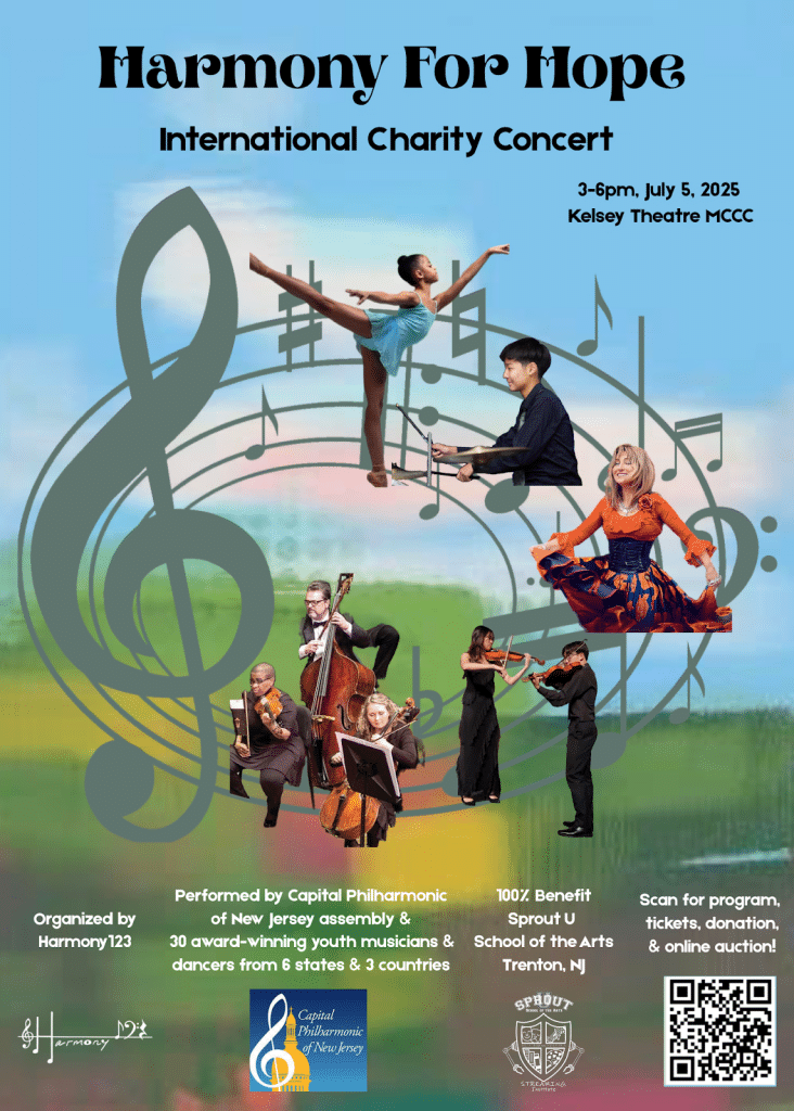 Sprout U School of the Arts and Harmony 123 invites music and arts lovers to the “Harmony for Hope” benefit concert featuring international youth musicians and a string quartet from Capital Philharmonic of New Jersey at 3 pm, Saturday July 5, 2025 in Kelsey Theater at Mercer County Community College, 1200 Old Trenton Rd. West Windsor.