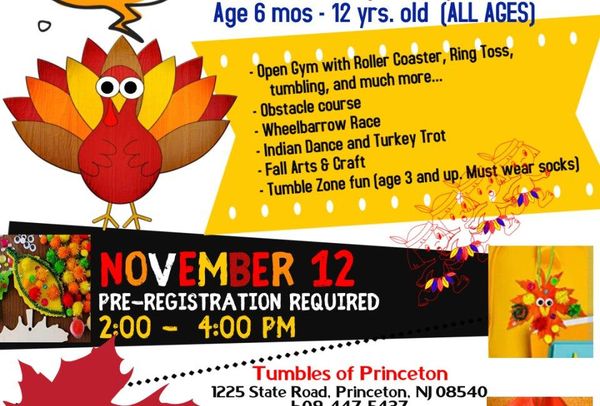 On November 12, there will be an open gym, dances, arts and crafts, and more at Tumbles Princeton. Some activities include obstacle courses, wheelbarrow races, the Turkey Trot, and the Tumble Zone. Registration is required. For tickets and more information, visit Mommy Poppins.com. Socks are required for Tumble Zone fun (age 3+). Parents must sign waivers; parental supervision is mandatory.